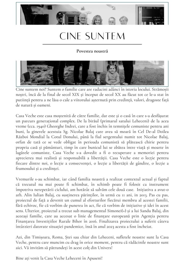Cine suntem noi? Suntem o familie care are radacini adânci în istoria locului. Strămoșii noștri, încă de la final de secol XIX și început de secol XX au făcut tot ce le-a stat în putiință pentru a ne lăsa o cale a viitorului așternută prin credință, valori, dragoste față de natură și oameni.